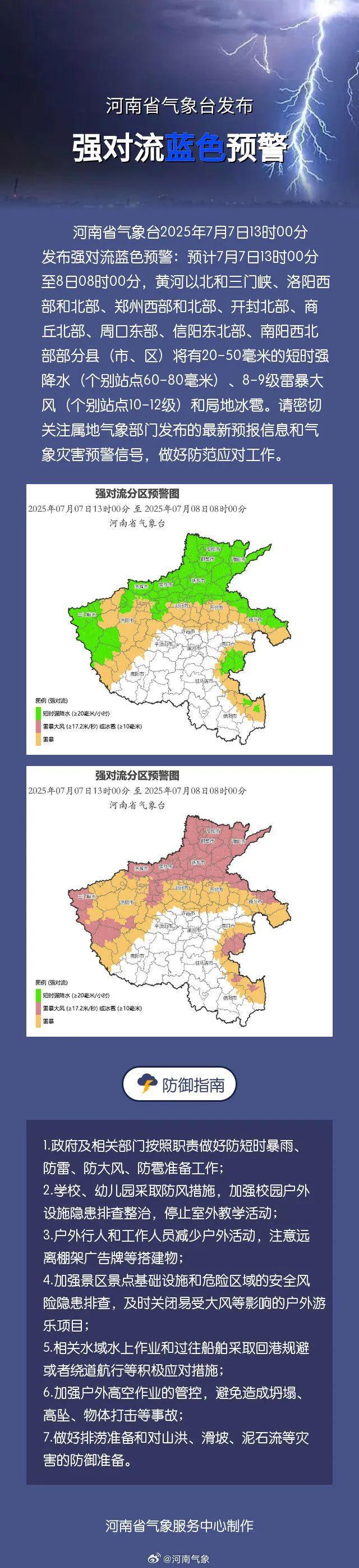 据最新气象资料分析,预计7月7日13时至8日8时,黄河以北和三门峡、洛阳西部和北部、郑州西部和北部、开封北部、商丘北部、周口东部、信阳东北部、南阳西北部部分县(市、区)将有20-50毫米的短时强降水(个别站点60-80毫米)、8-9级雷暴大风(个别站点10-12级)和局地冰雹。请密切关注属地气象部门发布的最新预报信息和气象灾害预警信号,做好防范应对工作。