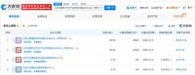天眼查App显示,近日,北京安鹏智行汽车产业股权投资基金合伙企业(有限合伙)成立,执行事务合伙人为深圳市安鹏股权投资基金管理有限公司,出资额10亿人民币,经营范围包括私募股权投资基金管理、创业投资基金管理服务等。合伙人信息显示,该基金由北汽集团旗下北京安鹏科创汽车产业投资基金合伙企业(有限合伙)、深圳市安鹏股权投资基金管理有限公司、张家口聚鑫股权投资基金合伙企业(有限合伙)、张家口家融投资管理有限公司共同出资。