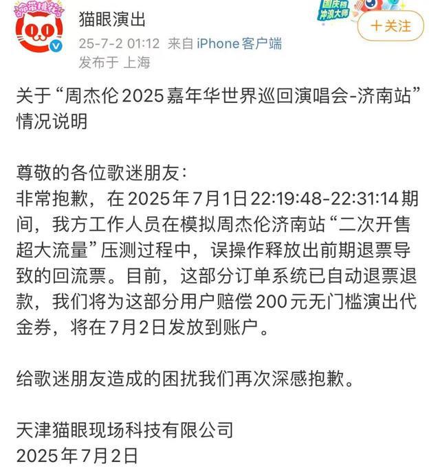 该公司发布关于“周杰伦2025嘉年华世界巡回演唱会-济南站”情况说明称,在7月1日22时19分48秒至22时31分14秒期间,工作人员在模拟周杰伦济南站“二次开售超大流量”压测过程中,误操作释放出前期退票导致的回流票。目前,这部分订单系统已自动退票退款,公司将为这部分用户赔偿200元无门槛演出代金券,将在7月2日发放到账户。给歌迷朋友造成的困扰再次深感抱歉。