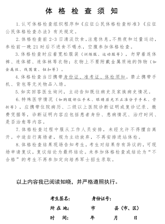 考生携带身份证、准考证、体格检查须知(自行打印),按政治考核所在地省辖市征兵办公室明确的时间、地点及相关要求参加体格检查。(见附件2、3)