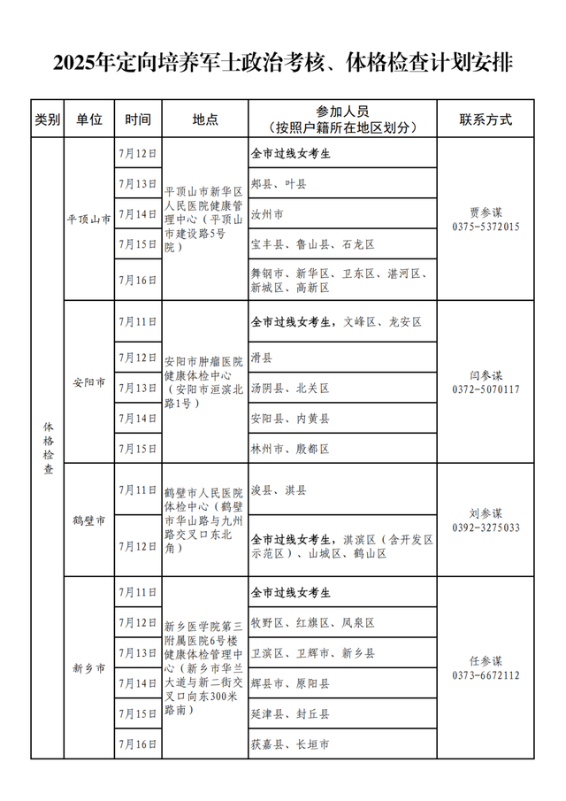 根据河南省教育厅、公安厅和省军区动员局《2025年招收定向培养军士工作实施方案》(豫军动〔2025〕7号),现将2025年普通高校招收定向培养军士政治考核和体格检查相关事宜予以公布,请达到控制分数线的考生,按要求参加政治考核和体格检查。