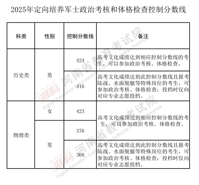7月8日,记者从河南省教育考试院了解到,河南省2025年普通高校招生定向培养军士政治考核和体格检查控制分数线“出炉”,具体信息如下: