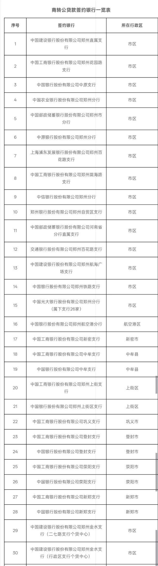 截至目前,郑州市“商转公贷款”业务“直还”方式的签约银行,市区有40家,航空港区、新密市、巩义市各1家,中牟县、上街区、登封市、荥阳市、新郑市各2家。