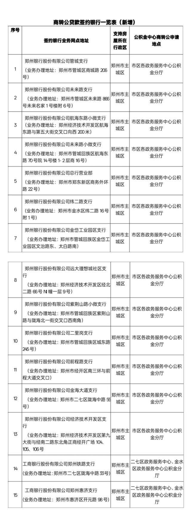 其中,此次新增的郑州银行各支行商转公贷款申请地点为市区各政务服务中心公积金分厅,工商银行两家支行商转公申请地点为二七区政务服务中心、金水区政务服务中心公积金分厅。