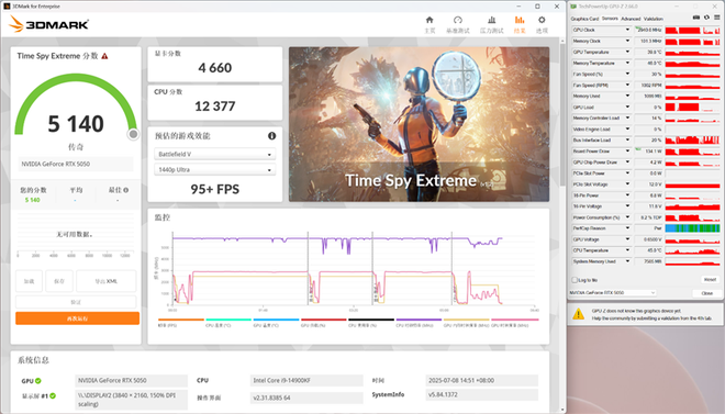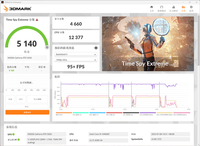 在3DMark的Time Spy Extreme(DX12+4K渲染分辨率)测试中,总成绩为5140,其中显卡分数为4660。