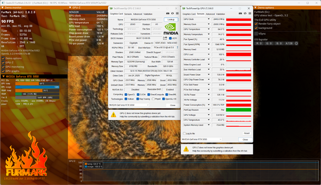 我们使用Furmark对技嘉RTX 5050 GAMING OC显卡进行10分钟的烤机,室温约29度,整卡功耗稳定在130W,核心频率2445MHz,温度64.0度,风扇转速1650RPM。