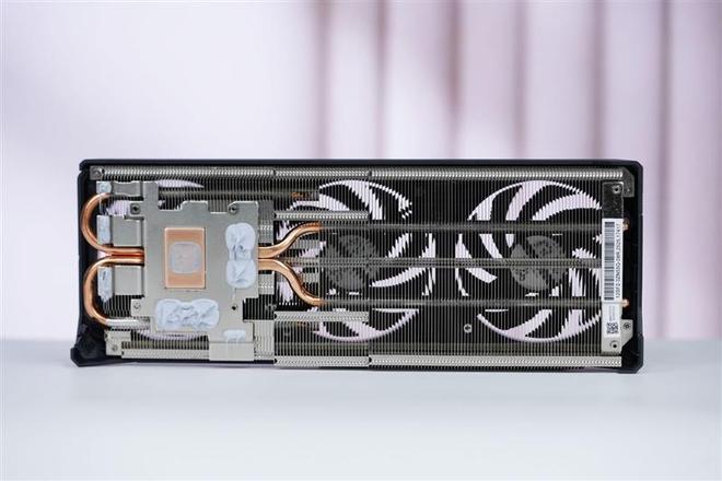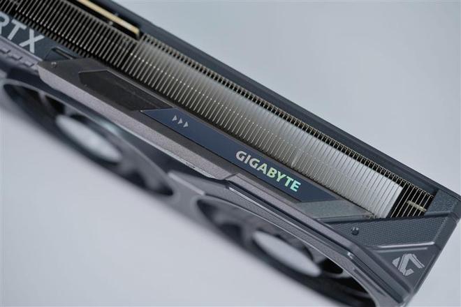 技嘉RTX 5050 GAMING OC显卡的加固背板同样是工业风设计,巨大的散热窗占到了约一半的长度,内部散热器鳍片和热管清晰可见。