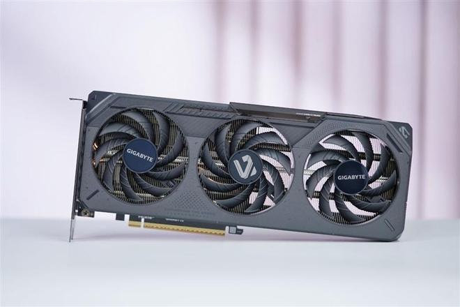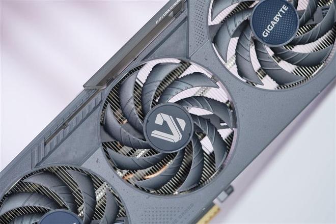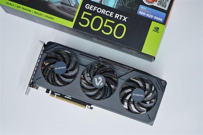技嘉RTX 5050 GAMING OC显卡保持了系列统一的硬朗工业风设计,表面有类似防滑条的刻线和点阵,三枚风扇采用正逆转设计强化散热效果。