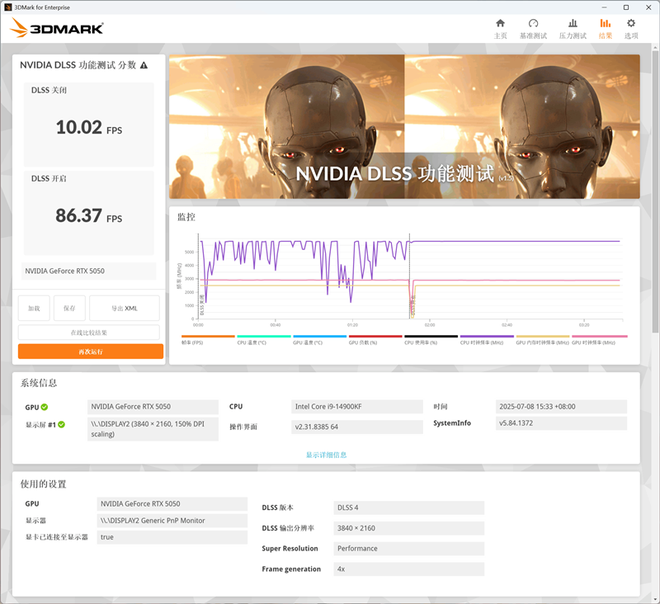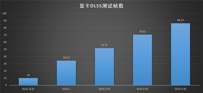 在3Dmark NVIDIA DLSS功能测试中,关闭DLSS 4时帧数为10FPS左右,开启DLSS 4 2x之后帧数上升为51.71PS,开启DLSS 4 3x之后帧数上升为70.52FPS,开启DLSS 4 4x之后帧数上升为86.37FPS。