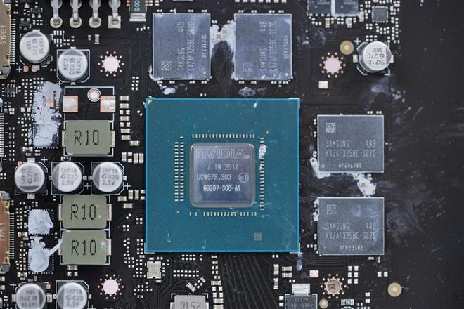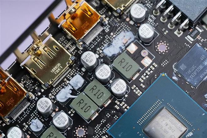 来自三星的GDDR6显存颗粒特写,一共四颗环绕GPU布置,共同构成8GB的容量。
