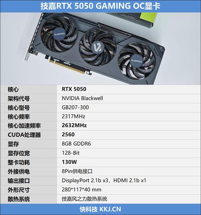 技嘉RTX 5050 GAMING OC显卡搭载NVIDIA Blackwell架构的RTX 5050 GPU,核心编号GB207-300,包含2560个CUDA核心(流处理器),80个第5代Tensor Core张量核心、20个第4代RT Core光追核心,配备8GB容量128-bit位宽显存,只需要一个8Pin供电额外。