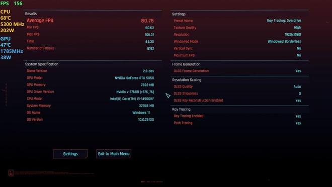 《赛博朋克:2077》在开启DLSS 4最高的4X级别多帧生成时,1080P分辨率下测试帧率为80.75。