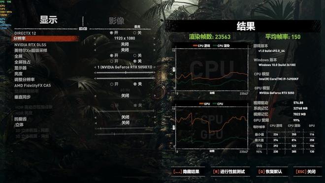 在《古墓丽影:暗影》中,使用最高画质进行测试,DLSS超级采样设置为质量,1080P分辨率下平均帧率为150。