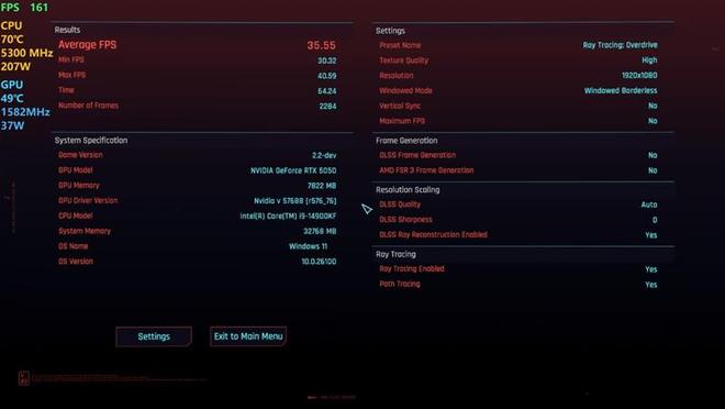 在《赛博朋克:2077》中,使用光线追踪:超速预设并打开DLSS帧生成,记录游戏帧数。
