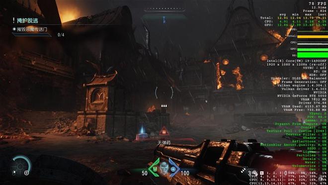 在《毁灭战士:黑暗年代》中,使用超级噩梦预设和DLSS超分辨率均衡,关闭路径追踪,记录游戏帧数。