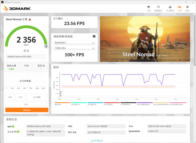 在3Dmark中测试可靠性、稳定性和持续性能的Steel Nomad测试中,总成绩为2356,其中显卡测试成绩为232.56FPS。