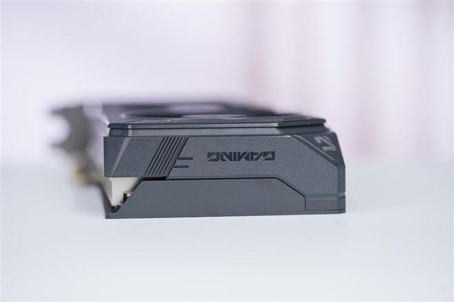 显卡尾部采用全封闭拼接设计,前盖延伸部分有细密的防滑点阵和"GAMING"字样。