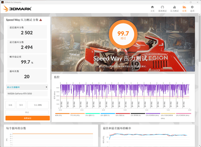 我们使用3DMark进行压力测试,连续运行20轮的Speed Way测试场景,最终测试成绩稳定性为99.7%,最佳成绩和最差成绩之间的差距非常小,帧率曲线上几乎完全重合,在长时间工作时技嘉RTX 5050 GAMING OC显卡的性能几乎没有波动,运行非常稳定。