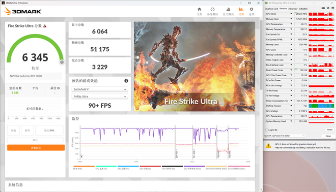 在3DMark的Fire Strike Ultra(DX11+4K渲染分辨率)测试中,总成绩为6345,其中显卡分数为6064。