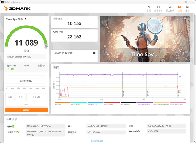 在3DMark的Time Spy(DX12+2K渲染分辨率)测试中,总成绩为11089,其中显卡分数为10155。