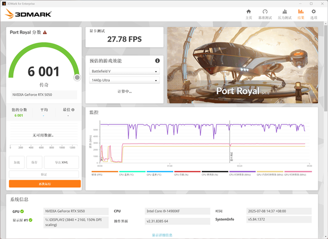 在3Dmark中测试实时光追性能的Prot Royal测试中,总成绩为6001,其中显卡测试成绩为27.78FPS。