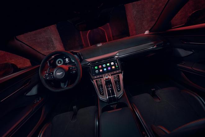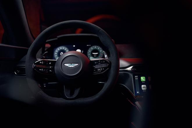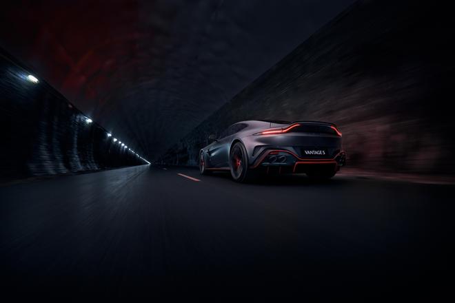 车身尾部,Vantage S的贯穿式尾箱盖扰流板设计大幅提升了辨识度,全新设计的后扰流板不仅以视觉张力强化性能基因,更能在车辆极速行驶状态下额外增加44公斤的车尾下压力,使整车极速总下压力达到111公斤。新扰流板的引入也进一步优化了整车的空气动力学表现,在增强行驶稳定性的同时,将整体下压力重心前移,从而带来更敏锐的入弯响应与持续的高强度弯道抓地力。此外,新增的前扰流板和前部文丘里导流叶片等底盘系统优化措施,共同贡献了另外67公斤的极速下压力增量。