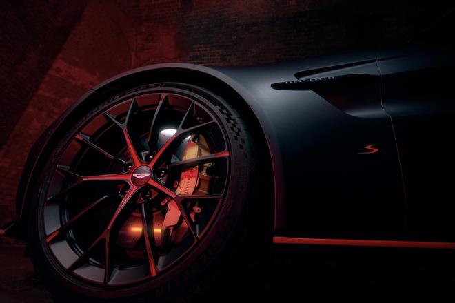 全新Vantage S的前部采用了中央布局的引擎盖导流翼片作为标志性设计。这些通风口翼片采用亮黑色或2x2斜纹碳纤维材质打造,不仅赋予前脸更具张力的设计风格,更优化了“Hot-V”结构V8发动机的散热气流排放效率。同时,还可选配专属定制的21英寸缎面黑Y形辐条轮毂,点缀红色轮毂饰条,延续了“S”系列车型标志性的红色元素设计,且与青铜色涂装制动卡钳优雅撞色,别具特色。