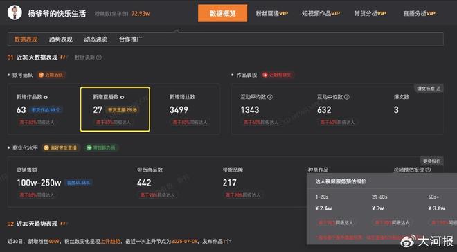 据大河报从第三方数据和天眼查平台了解到,“杨爷爷的快乐生活”近30日直播27场,其中带货直播25场。杨光的快乐生活被注册为商标。(大河报)