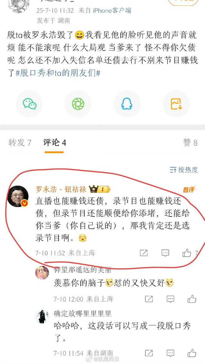 罗永浩回怼这位网友:“直播也能赚钱还债,录节目也能赚钱还债,但录节目还能顺便给你添堵,还能给你当爹(你自己说的),那我肯定还是选录节目啊。”