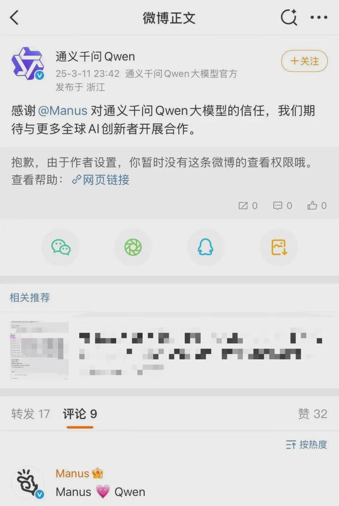 通义热情转发,Manus却删了原文,显得通义一厢情愿,Manus只留下了评论区的小红心❤️。