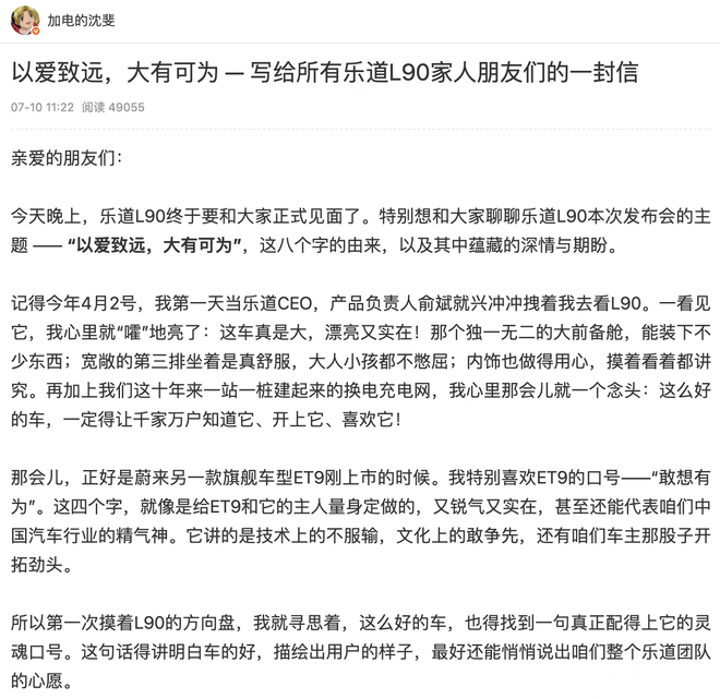 比起冗长的技术介绍,发布会前夕乐道CEO沈斐在微博上发的长文更有看头,算是为这款备受瞩目的新车揭开了核心理念“以爱致远,大有可为”的深层含义。