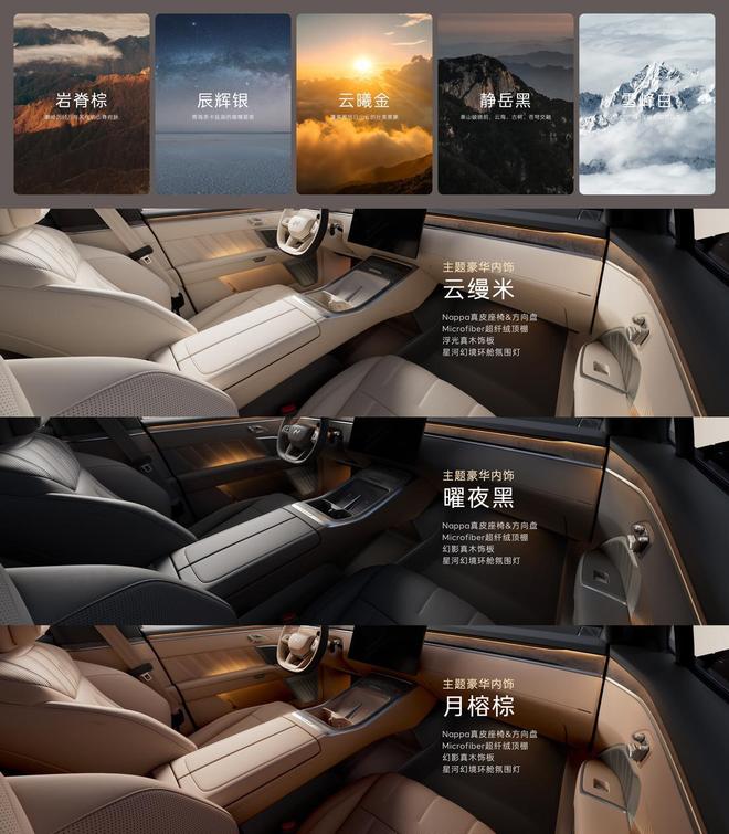车身颜色方面,蔚来乐道L90共发布岩脊棕、辰辉银、云曦金、静岳黑、雪峰白五款车身色彩主题,每一款色彩灵感均取自于自然景观。内饰颜色上,拥有云缦米、曜夜黑、月榕棕三种内饰色彩主题可选。