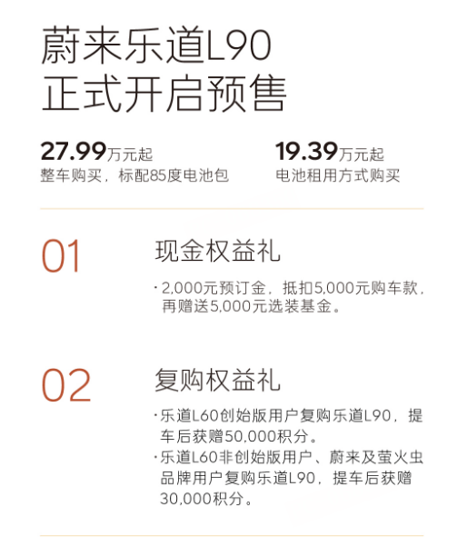 权益方面,现在下订,即可享2000元预订金抵扣5000元购车款,再赠送5000元选装基金。同时,乐道L60创始版车主复购提车,可获赠50000积分;乐道、蔚来及萤火虫品牌车主复购提车,可获赠30000积分。