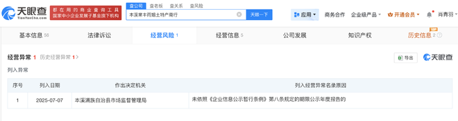 天眼查App显示,近日,本溪常丰雨姐土特产商行因未依照规定的期限公示年度报告,被本溪满族自治县市场监督管理局列入经营异常名录。