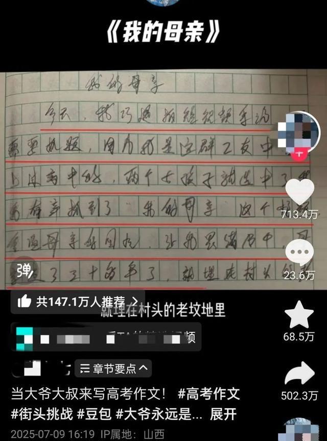 山西大爷写《我的母亲》作文打动无数网友,视频发布者最新回应:版权收入会全给大爷