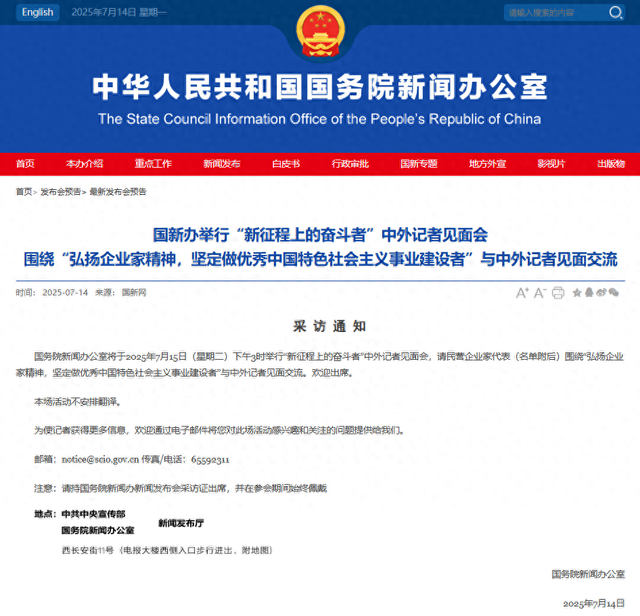 据国新网7月14日消息,国务院新闻办公室将于2025年7月15日(星期二)下午3时举行“新征程上的奋斗者”中外记者见面会,请民营企业家代表围绕“弘扬企业家精神,坚定做优秀中国特色社会主义事业建设者”与中外记者见面交流。