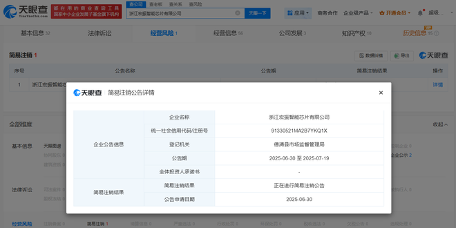 天眼查App显示,近日,浙江宏振智能芯片有限公司新增一条简易注销公告,公告期为6月30日至7月19日。该公司成立于2019年11月,注册资本1000万人民币,由浙江德清娃哈哈科技创新中心有限公司、董林玺共同持股。不久前,该公司刚发生变更,宗庆后卸任法定代表人、董事长,由宗馥莉任董事。