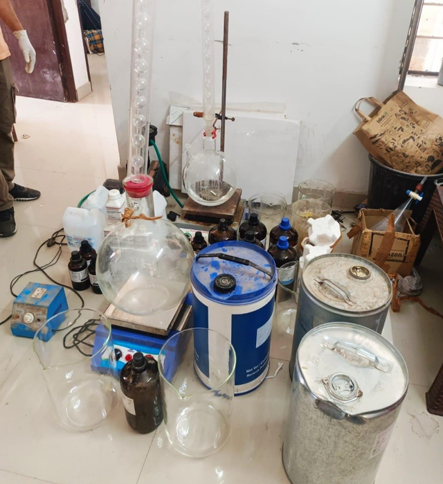 两名理科老师以1万卢比的价格在当地一高档公寓租住了一间两居室,并将其秘密改造为制毒实验室。据NCB通报,这两人从新德里采购化学品和设备,并专门请假来生产MD。在过去两个多月里,两人制造了约5公斤MD毒品,市值约1.5亿卢比。据NCB区域负责人甘希亚姆·索尼表示,其中4.22公斤毒品已经被他们出售。警方在突袭该公寓时缴获了780克MD毒品和现代设备,此外还查获丙酮、苯、碳酸氢钠、溴等易制毒化学品。