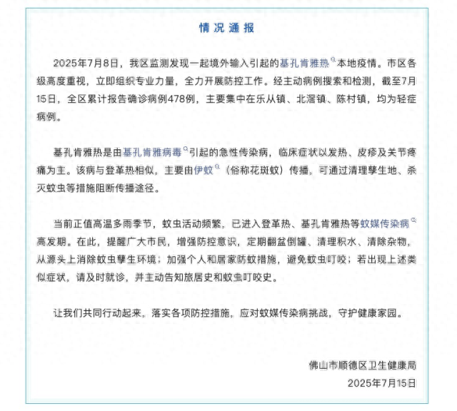 7月15日,佛山市顺德区通报一起境外输入引起的基孔肯雅热本地疫情,截至通报发布,顺德全区累计报告确诊病例478例,主要集中在乐从镇、北滘镇、陈村镇,均为轻症病例。