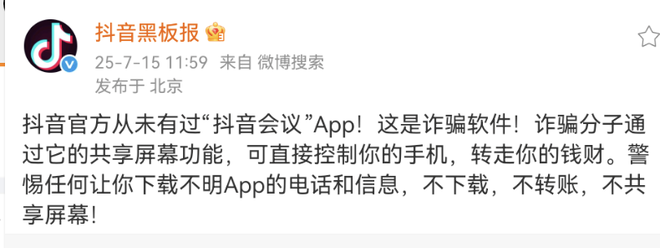 7月15日,据抖音黑板报,抖音官方从未推出过名为“抖音会议”的App。该App被指为诈骗软件,诈骗分子利用其共享屏幕功能,可能直接控制用户手机并转走用户财产。