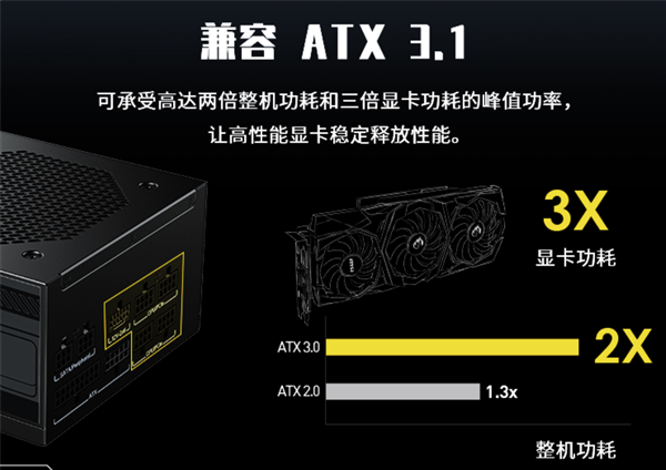该系列电源遵循Intel ATX 3.1标准设计,可承受高达2倍整机功耗和3倍显卡功耗的瞬时峰值功率。
