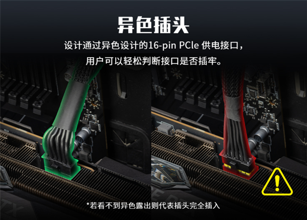 同时还采用了明黄色"异色设计"接口,只需观察接口边缘的亮色区域是否可见,就能判断16-Pin显卡供电线是否完全插牢,若看不到异色则代表完全插入,大幅提升安装安全性与便捷性。