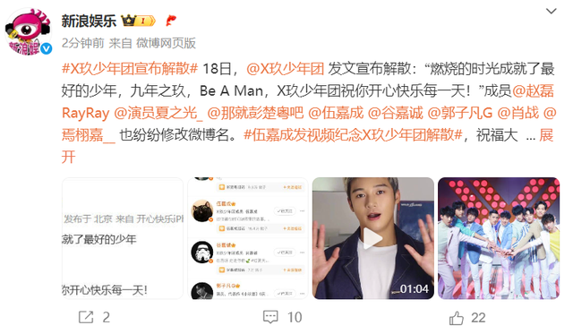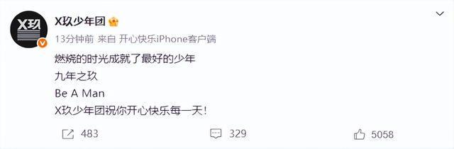 随后,7月18日晚间,@X玖少年团 发文:燃烧的时光成就了最好的少年,九年之玖。Be A Man,X玖少年团祝你开心快乐每一天!