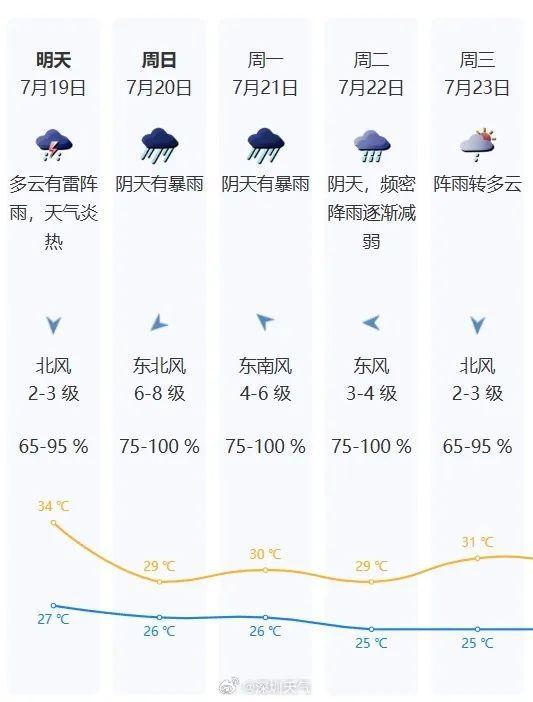 19日我市多云间晴天,间中有雷阵雨,雷雨时最大短时阵风8级左右,气温27-34℃;