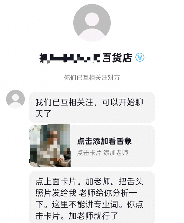 记者注意到,其中一个名为“XXX百货店”的账号,并不具备医疗资质。直播时,该账号直播间背景画面设为三张舌头图片,舌苔表现状态不一。主播一边介绍相关中医知识,一边让大家在直播间公屏上“认领”适合自己的舌苔图片。“你湿气太重,脾胃失和”“你体寒虚弱,需要调理”,主播在“专业”讲解网友“病情”的同时,还不断提醒网友尽快添加其微信。