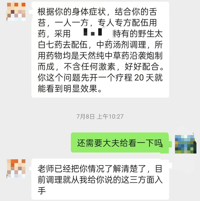 记者按要求添加微信后,对方一上来就让记者发送舌苔照片,并很快指出存在的“问题”。简单询问后,对方又很快开出治疗方案,并表示,只需调理一个疗程即20天后,目前存在的问题就会得到基本解决。随后其发过来一家公司的收款码,催促记者付费。