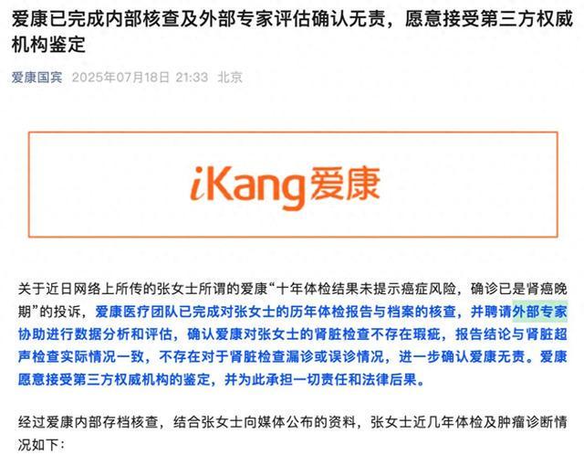 爱康国宾在18日晚的声明中表示,爱康医疗团队已完成对张女士的历年体检报告与档案的核查,并聘请外部专家协助进行数据分析和评估,确认爱康对张女士的肾脏检查不存在瑕疵,报告结论与肾脏超声检查实际情况一致,不存在对于肾脏检查漏诊或误诊情况,进一步确认爱康无责。爱康愿意接受第三方权威机构的鉴定,并为此承担一切责任和法律后果。