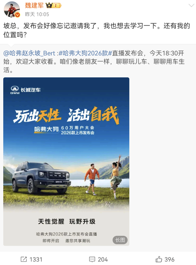 7月17日,长城汽车哈弗品牌总经理赵永坡宣布哈弗大狗2026款直播发布会于18:30开始。然而,长城汽车董事长魏建军转发该微博表示自己未被邀请,并幽默地询问是否有他的位置。