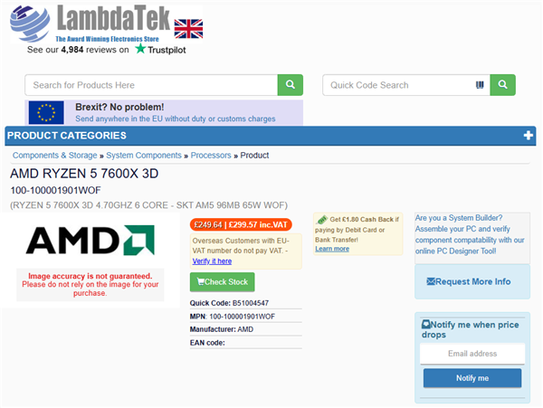 全球第四个!锐龙5 7600X3D在英国上架:卖到了近2900元