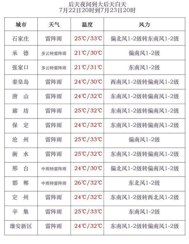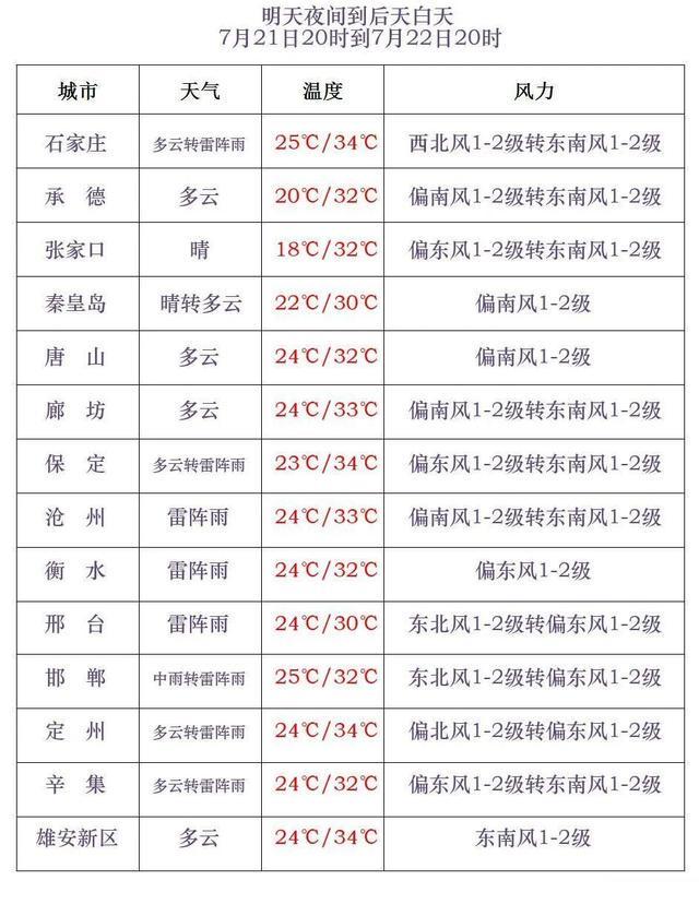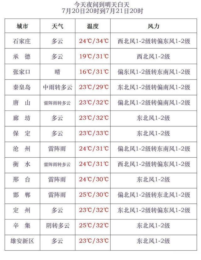 今天傍晚到夜间,唐山中南部、秦皇岛中南部,石家庄西部、沧州、衡水、邢台、邯郸阴有雷阵雨或阵雨,局地有中雨,雷雨时局地伴有短时强降水、短时大风等强对流天气,其他地区多云。最低气温,张家口、承德、保定西北部10~20℃,其他地区21~25℃。
